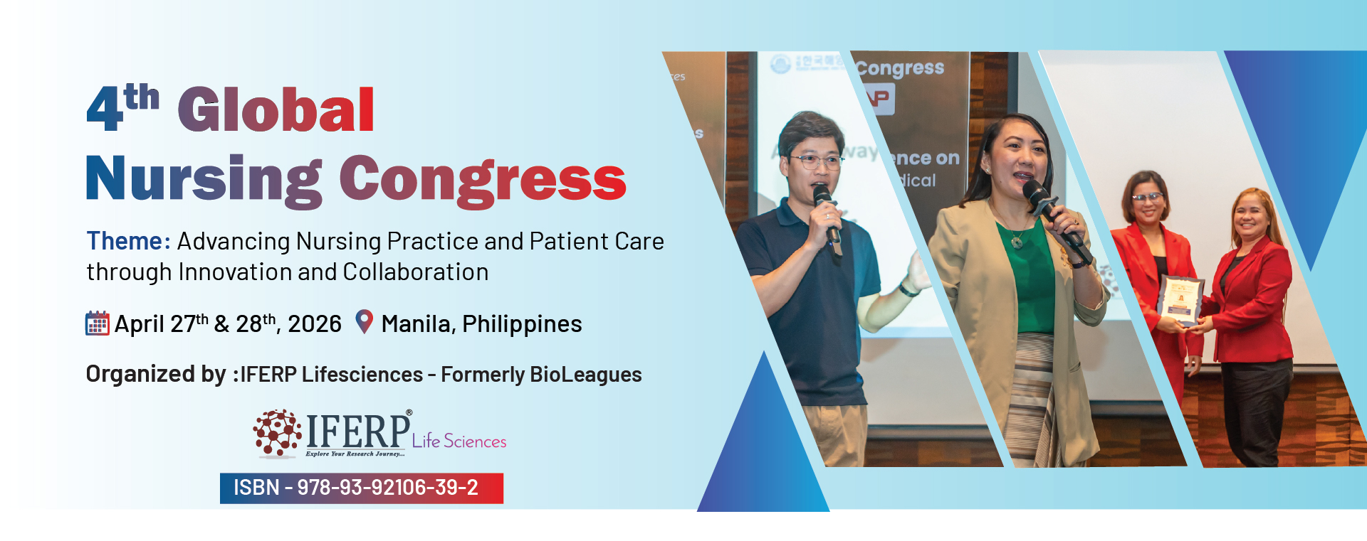 4th Global Nursing Congress (GNC-2026), organized by IFERP Life Sciences—Formerly Bioleagues, will be held on April 27th–28th, 2026, in Manila, Philippines. Centered on the theme “Advancing Nursing Practice and Patient Care through Innovation and Collaboration,” the congress brings together nursing professionals, researchers, educators, and healthcare leaders from around the world. GNC-2026 serves as a dynamic platform to share cutting-edge research, exchange knowledge, and explore innovative practices in nursing and patient care. Join us to network, collaborate, and contribute to shaping the future of global healthcare through nursing excellence.